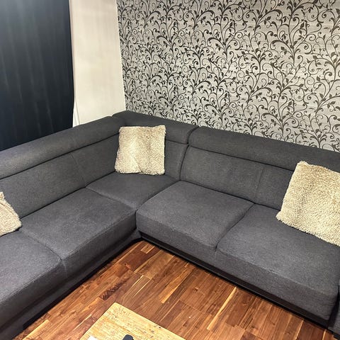 Bohus hjørnesofa i grått stoff med chaiselong. Sofaen har avtagbare puter i rygg og seter. Har kjøpt til en ekstra sittepute slik at en kan velge å bruke sofaen med eller uten chaiselong. Mål på sofaen er 210 x 310 cm .Passer for stue og oppholdsrom.