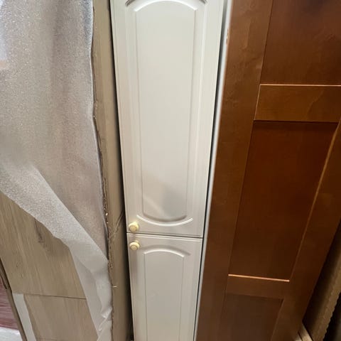Hvit høyskap med flere åpne hyller. Skapet har en dør med håndtak og er egnet for oppbevaring i baderom eller andre rom. Døren går ikke helt igjen men går nok ann og fikse. Selges grunnet flytting