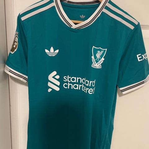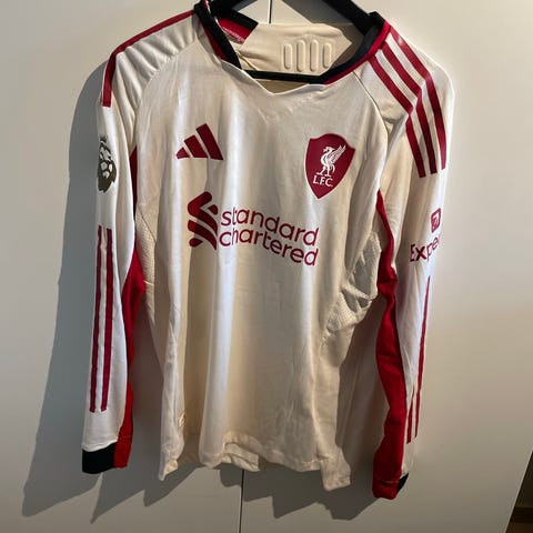 Liverpool fotballdrakt i størrelse Medium. Drakten er rød med hvite detaljer og har Premier League-logo på ermet. Materialet er lett og egnet for sport og trening. Kjøpt på DH gate. Spiller versjonstoff.