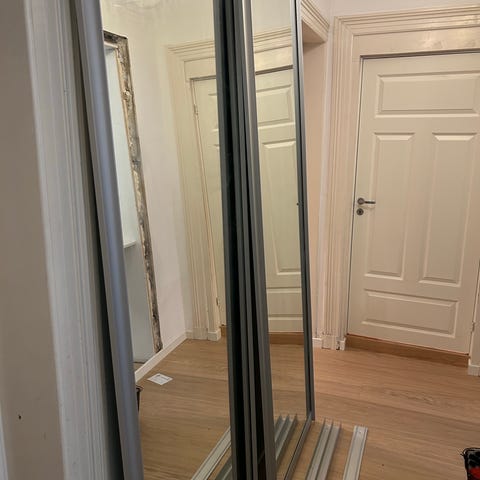3 stk dører med mål H 212 x B 94 cm. To hvite matte og en speil dør. Skinner til gulv og tak følger med om du ønsker.