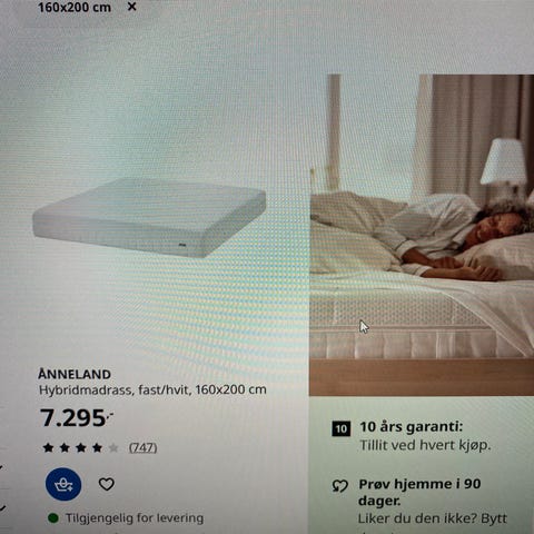 IKEA Ånneland madrass i hvit farge. 1 år gammel. Selges pga. lett parfymering fra gjester