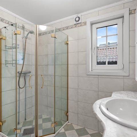 Tori dusjhjørne i glass med sort ramme. Passer til baderom, gir en moderne og funksjonell løsning for dusjområdet.