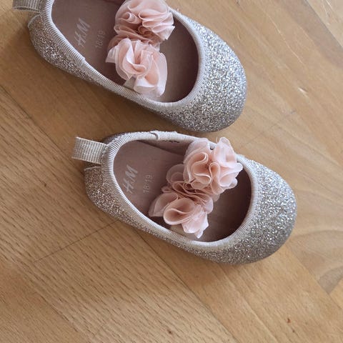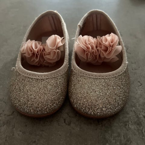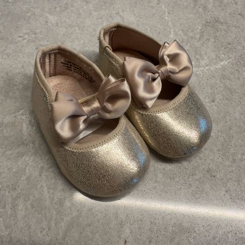Nesten ikke brukte ballerinasko, gull og glitter med sommerfuggelpynt.