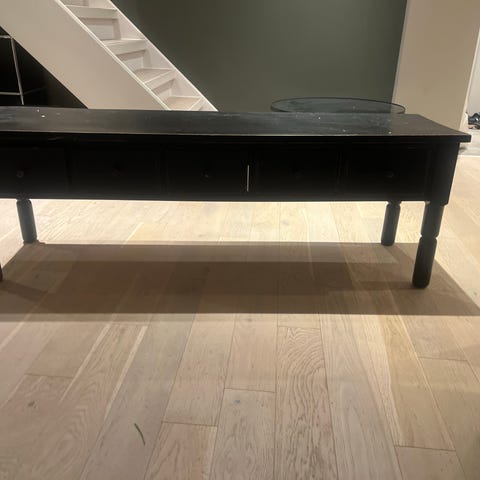 Denne er malt sage grønn men har en del bruksmerker. Er ganske lav så kan fint brukes som tv benk. Har blitt brukt både til ekstra kjøkkenplass og som bokhylle :)