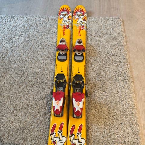 Rossignol Hero 70cm. Skiene er kun prøvd en gang og til synes helt nye. Bindninger fra Look som er justerbare og passer støvler med sålelengde mellom 195-240mm. Se også separat annonse for støvler som passer bindning og ski.