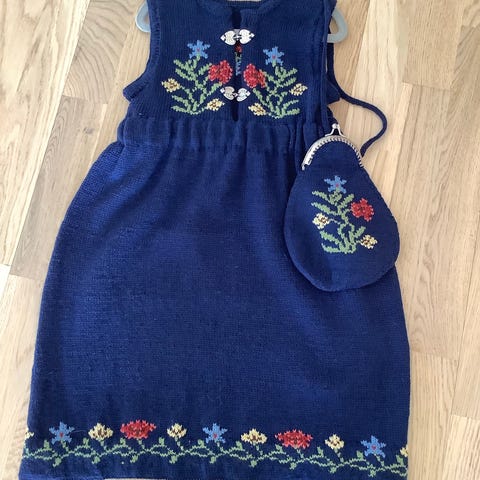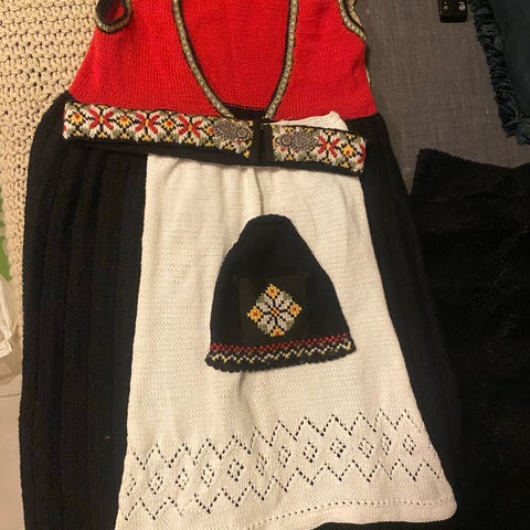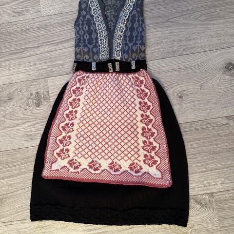 Vakker bunad strikket og sydd. Den er forseggjort med ulike detaljer (som vises på bilder), og har også sjal og hårbånd. Den er kløfri!