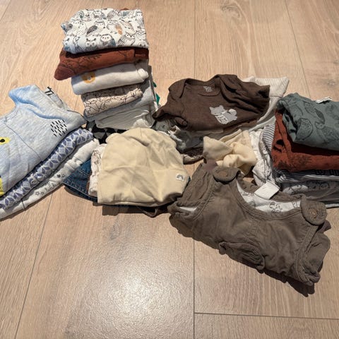 Klærne er pent brukt. Den hvite Joha-bodyen i ull/bambus har en gul misfarging nederst på ermet som jeg ikke har fått bort (se bilde). Røyk- og dyrefritt hjem. Selges samlet.