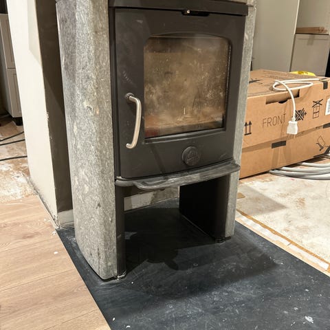 Aduro vedovn i svart stål med rund design og glassdør. Egnet for oppvarming av bolig med ved som energikilde.