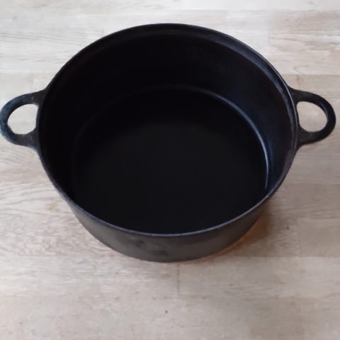 Selger en støpejernsgryte på 4L da den ble litt mindre enn jeg så for meg. Kun brukt én gang. Den har en liten kosmetisk feil i lokket som var sånn da jeg kjøpte den, men er ellers hel og pen, tett og fungerer som den skal.