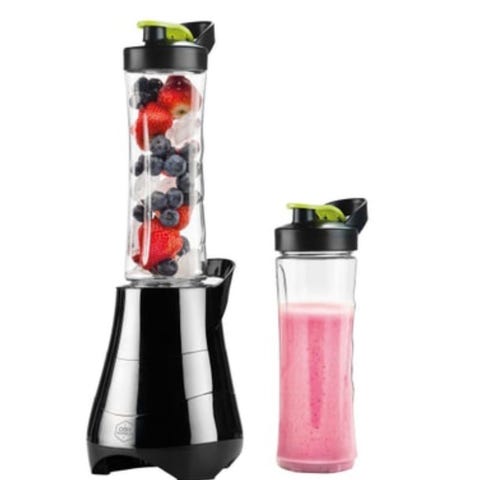 Kompakt og grei blender meg lokk til flasken som gjør den lett å ta med seg.