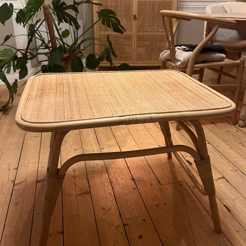 Stuebord i bambus og svart metall. Bordet er ca 50 x 40 cm og ca 45 cm høyt