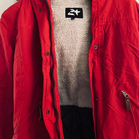 Twentyfour Annet yttertøy i størrelse L for kvinner. Jakken er rød og laget av bomull. Produktet har hette med pelskant og glidelås foran. Passer til utendørs bruk.