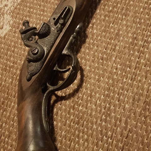 Dekorpistol, antikk replika, historisk våpen, samlerobjekt, flintlås stil, vintage dekor, militærhistorie