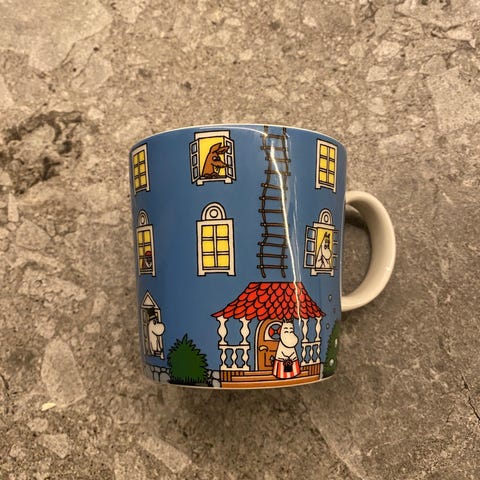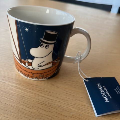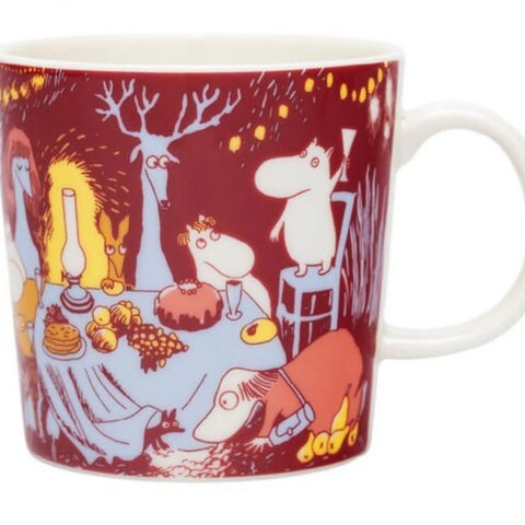 Selger en mummikopp med motivet Lille my rød. Koppen er utgått av sortimentet, og er fra 2016.