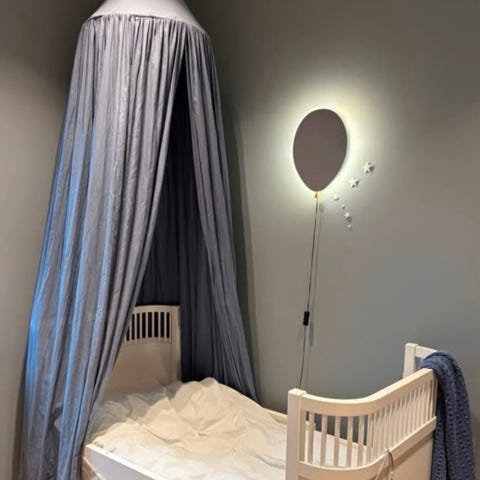 Nydelig og luftig sengehimmel fra Kid❤️ Hengt til pynt på barnerom noen få måneder, over en seng som aldri ble brukt😅 Fargen er midt mellom beige og grå, mest riktig på de to nærbildene av stoffet. Høyde/lengde: 230 cm.