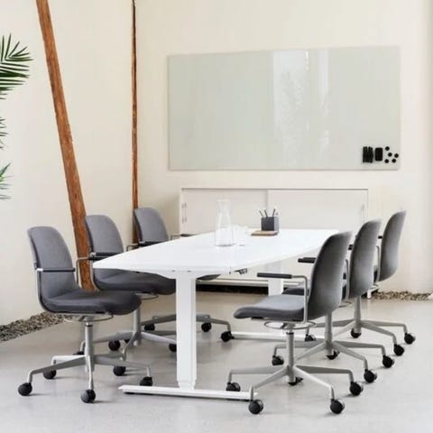 Whiteboard med stativ i metall og markerholder. Tavlen har en hvit skriveflate og er utstyrt med en oppbevaringslomme for tusjer. Stativet har justerbare ben for stabilitet.