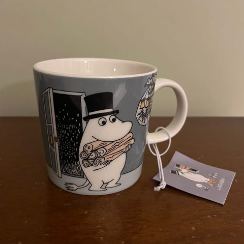 Selger en mummikopp med motivet mummipappa blå. Koppen er utgått, og fra 2014.