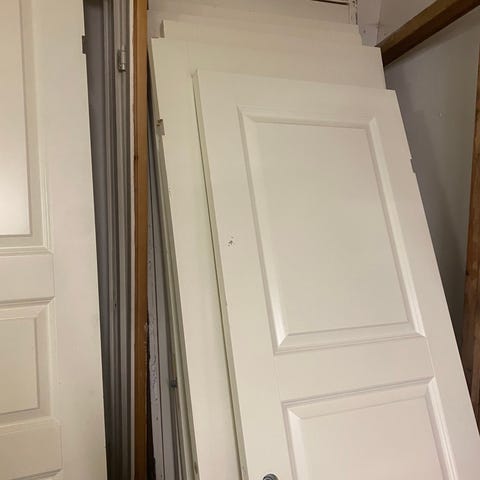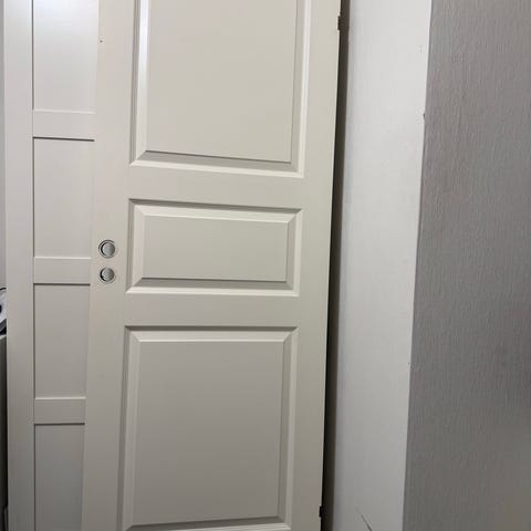 Hvit formpresset innerdør med 3 speil. Klassisk design, pent brukt og i god stand. Mål: 80 x 210 cm.. Ramme følger ikke med. Må hentes før nåkommende mandag(19.01