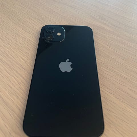 Apple iPhone 12 med 64 GB lagringskapasitet i svart farge. Ingen riper på selve skjermen da det er brukt beskyttelsesglass. Telefonen har tegn til bruk med noe slitasje på kantene.