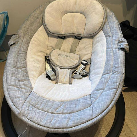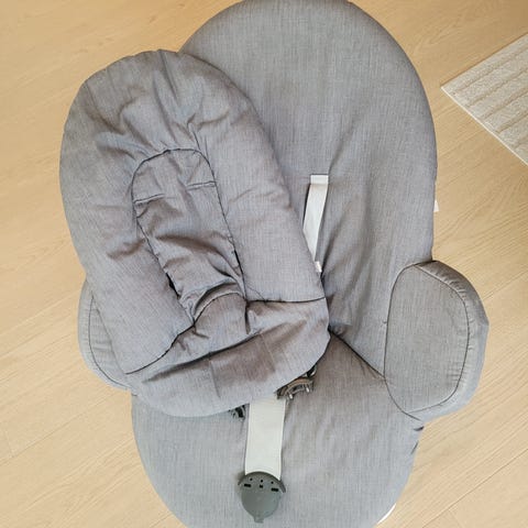 Stokke barnevippestol i grå farge. Følger med polstret sete for nyfødt, nyvasket. Justerbar ryggstøtte for tilpasning av sittestilling. Kommer fra røykfritt hjem.