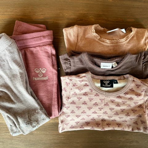 2 bodyer med tilhørende 2 bukser fra Haust and Claire i størrelse 86, body + bukse fra Devold størrelse 86, bukse fra Joha størrelse 86/92, body fra name it størrelse 92 og genser i merinoull fra Cubus i strl 92.