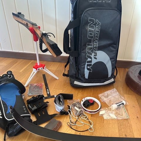 Buen, en Martin Archery Cheetah har sikker ikke blitt skutt mer enn 100 ganger totalt, men alt har som sagt stått lagret på bod i flere år. Buen kommer i en solid Plano koffert. Av tilbehør er det en del piler, blinker, solid skytematte, utstyr for å endre dra lengde på buen, underarms beskyttelse, pilkogger og et par småting jeg ikke helt kan huske hva er til.