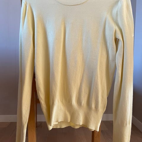 Zara genser i størrelse L for kvinner. Genseren er gul og brun med stripemønster og er laget av 80% viskose og 20% polyamid. Ikke brukt