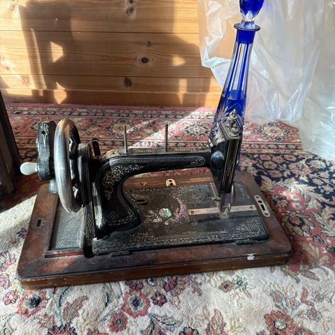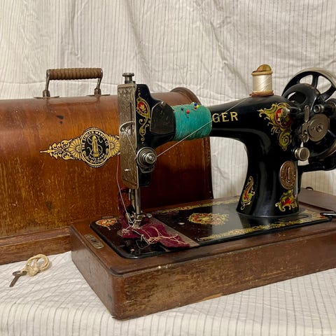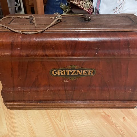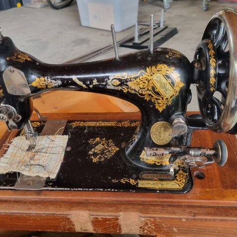 Symaskin med håndsveiv montert på en tresokkel. Maskinen har en mekanisk betjening og dekorative detaljer på metallrammen. Egnet for manuell søm og reparasjoner.