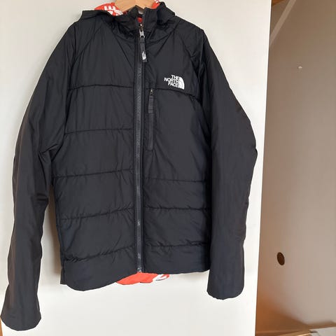 Flott helårsjakke. Kan brukes på begge sider. Den ene siden er sort, den andre grå. Den sorte siden har to stikklommer med fleece inni og en stor brystlomme med glidelås med plass til mobil.