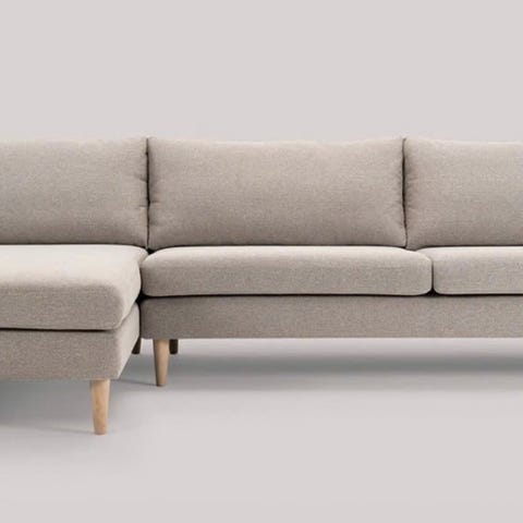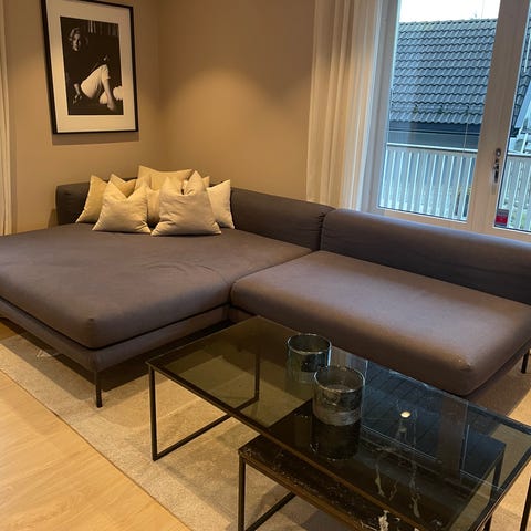 Stor hjørnesofa i ullstoff med sjeselong. Består av tre moduler og er enkel å sette sammen. Har også to fotstøtter som kan trekkes ut, samt nakkestøtter. Kjøpt på Falk møbler i 2017. Ny pris: 40 000 kr.