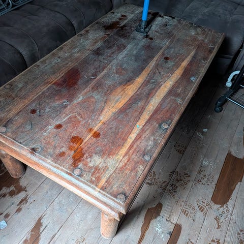Godt brukt stuebord/salongbord brukt i barnestue. Masse bruksmerker, men blir nok godt som nytt med litt pussing og maling. Trolig heltre. Gis bort mot henting.