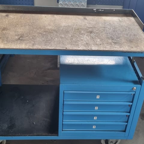 Verkstedskap med flere skuffer og skapdører. Farge: blå. Egnet for oppbevaring av verktøy og annet utstyr i verksted eller garasje. 150cm bred og 55 cm dyp. Solid skap i stål.