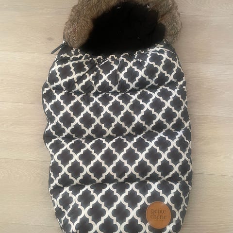 Petite Cherie barnevognpose med mønstret design i svart og hvitt. Passer til bruk i barnevogn for å holde barnet varmt og beskyttet.