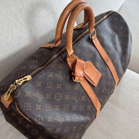 Louis Vuitton Keepall 50 i klassisk monogram canvas. Vintage reisetaske med mye brukspreg og patina på skinnet. Håndtak og skinnhjørner er mørkere og har normal vintage slitasje. Glidelås og metall har alderstegn. Hengelås følger med (nøkkel ikke funnet). Perfekt som vintagebag eller til samling.