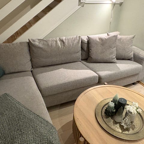 Sofaen er ca 5 år gammel, men ser fortsatt fin ut. Den trenger bare en rens eller en en vask av trekkene. Trekkene kan tas av og vaskes i maskin. Den pleier å bli som ny etter rens/vask.