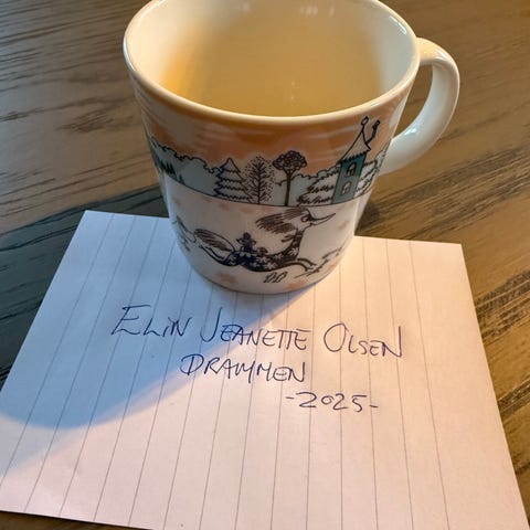 Selger en pent brukt mummikopp med motivet Tufsla og Vifsla. Koppen er fra 2018.