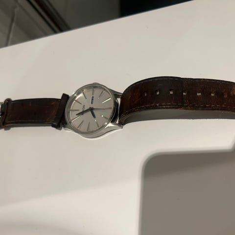 Omega vintage klokke med rund urskive og brun lærrem. Klokken har en enkel og klassisk design med tydelige timeindikatorer.
