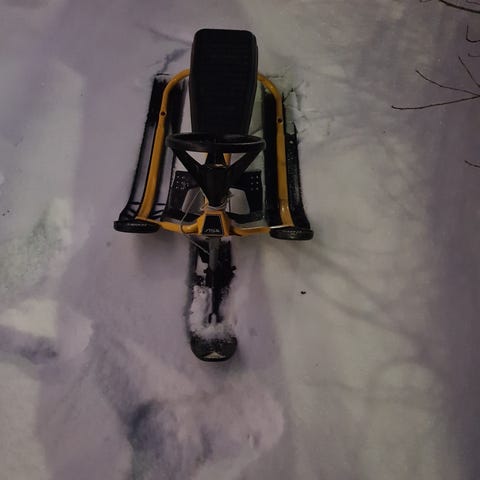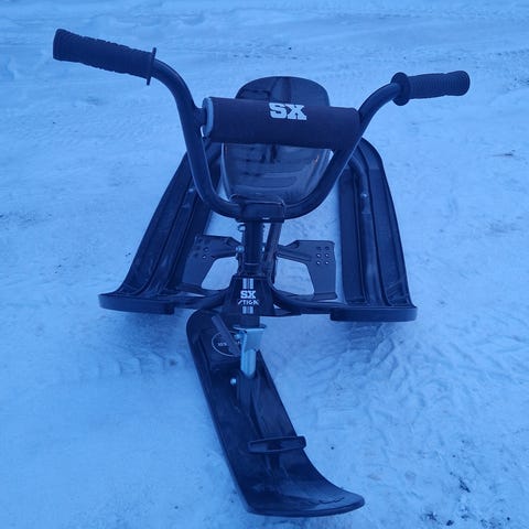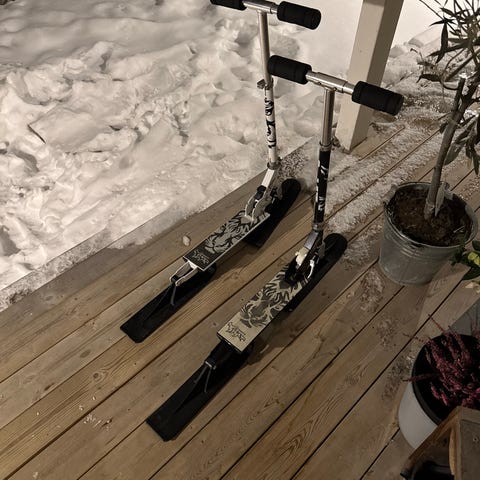 Litt rust og ganske slitt ski på den. Styre skia har en sprekk i festet og må vel skiftes etterkvart (vises på ene bildet)