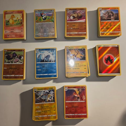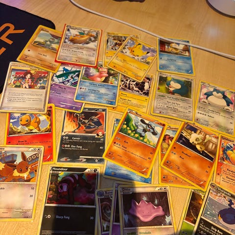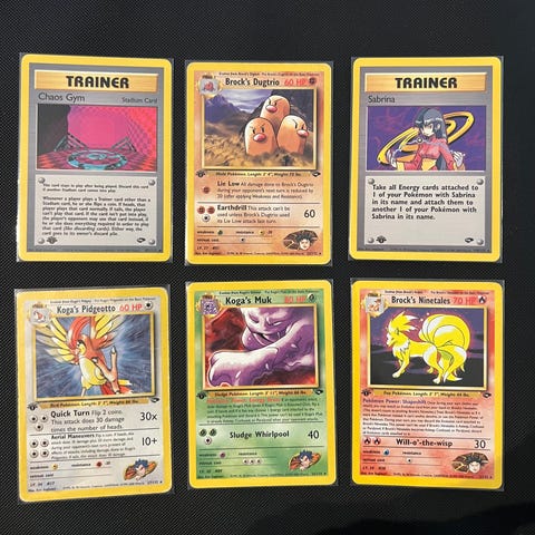 Pokémon samlekort series one med ulike figurer som Onix, Scyther, Tauros,Seaking/Goldeen og Magikarp/Gyarador.