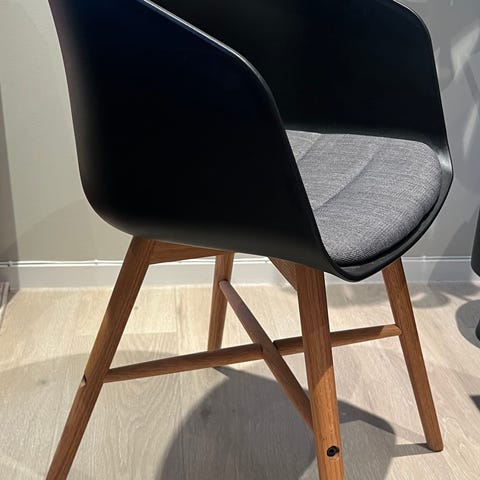 Selges som komplett sett med 4 stoler. Stoffet er lett å holde rent.