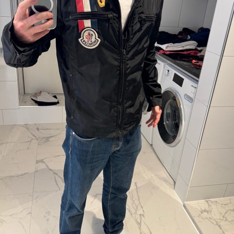 Moncler Jakke i størrelse M, farge blå. Jakken er designet for menn og egner seg til utendørs bruk.