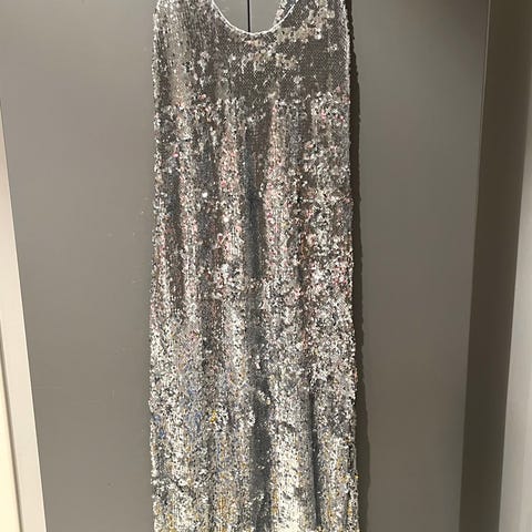Helt ubrukt paljettkjole i str M fra Culture Fashion. Kjøpt for 1199,95 kr. Kjolen har 2 lag der det ytterste er et gjennomskinnelig stoff med gull paljetter, og underkjolen er i et glatt silkeaktig stoff. Kjolen former seg pent nedover på kroppen.