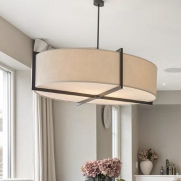 Selger den store versjonen som har en diameter på 29 cm og passer perfekt over et spisebord eller stuebordet. Spisebordet som er avbildet i annonsen har dimensjonen 210 x 100 cm. Wire og tekstilledning er tilpasset en takhøyde på 2,4 meter. Lampens organiske former og detaljer, skaper en mykhet til designets ellers maskuline look. Selger 2 taklamper samlet for 5 000 kr. En for 2 800 kr. Kan sendes.