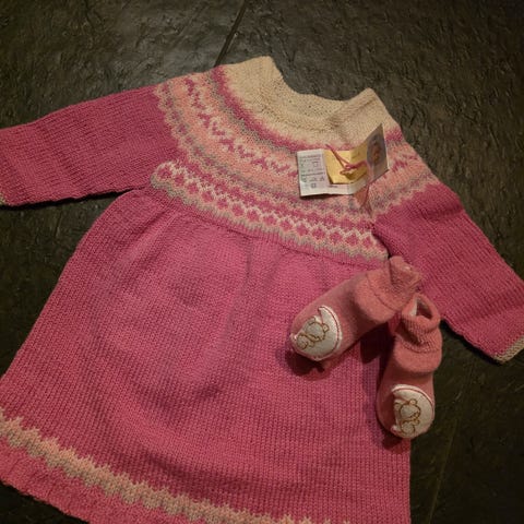 Selger en ubrukt hvit body med blonde krage og en rød strikket kjole i str 62. Jenta vår rakk dessverre ikke å bruke denne før den var for liten, er derfor ubrukt med lapper.
