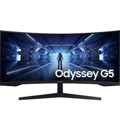 Samsung Odyssey G5 34" buet gamingskjerm med bred 34-tommers WQHD VA-panel. Skjermen gir rask og jevn bildekvalitet med 165 Hz oppdateringsfrekvens, 1 ms responstid og AMD FreeSync Premium.
