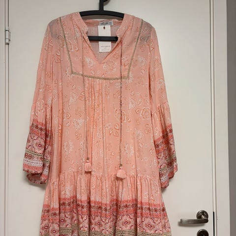 Brun/offwhite kjole med rosa detaljer fra Last Queen. Størrelse S. Strikk i livet. Tasler og snøring på bryst, rosa heklet detaljer på kanter. Trompet armer. Lengre bak enn forran. Viskose stoff. Brukt 1 gang så fremstår som ny. Kan sendes mot porto