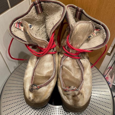 Selger disse pent og lite brukte selskinnskoene, som er en arv fra svigermor. Perfekt for kalde dager. Det er lagt noen ekstern soler i skoene, jeg ville byttet ut disse med ull soler.