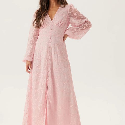 Midikjole i sateng fra Bubbleroom Occasion med en blondedetalj på ermene og ved midjen.