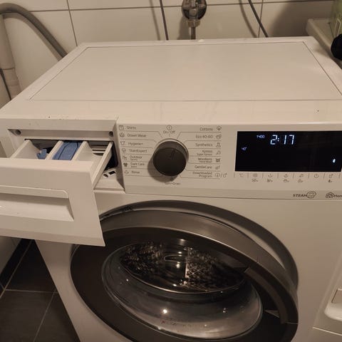 Vaskemaskinen fungerer som den skal. Kapasitet opptil 8 kg.