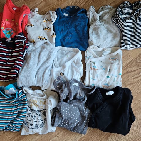 Kjempefin klespakke i str 68. Inneholder: isolert fleecedress, to par ulltøfler, en ulljakke fra Janus, to pysjer, en heldress, 4 bukser og en body.